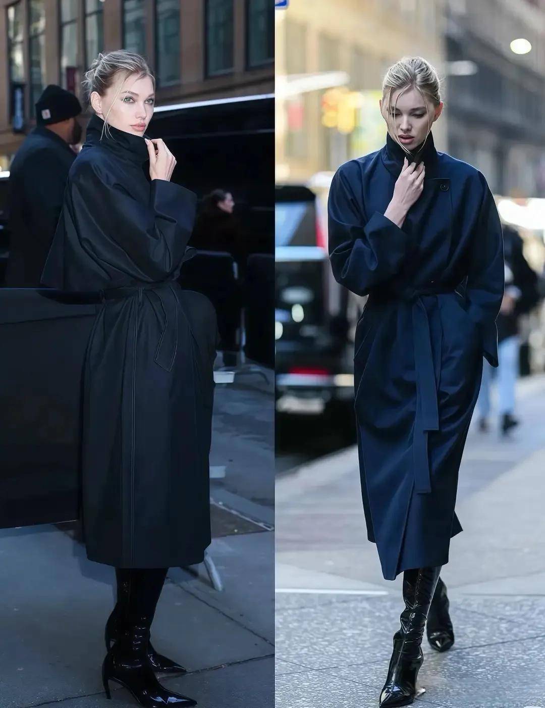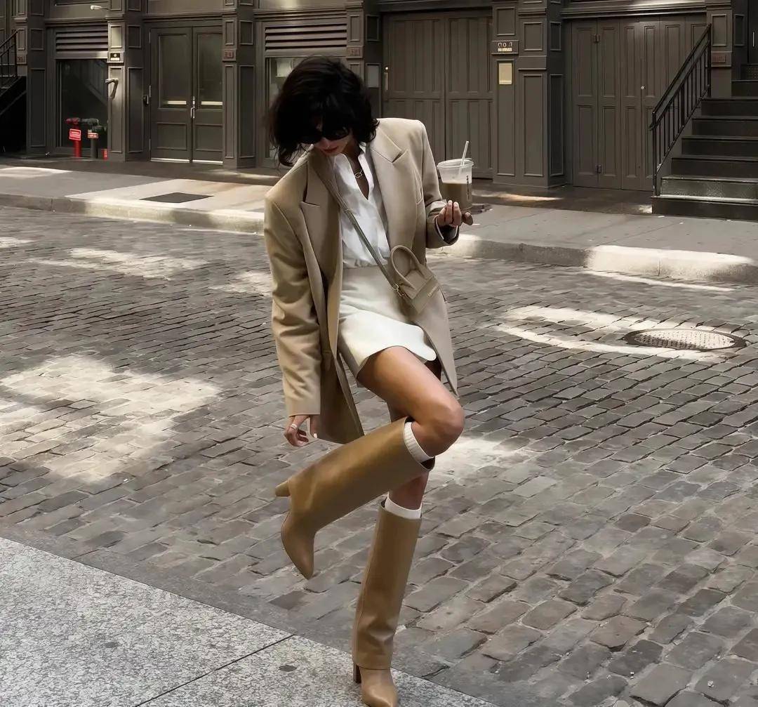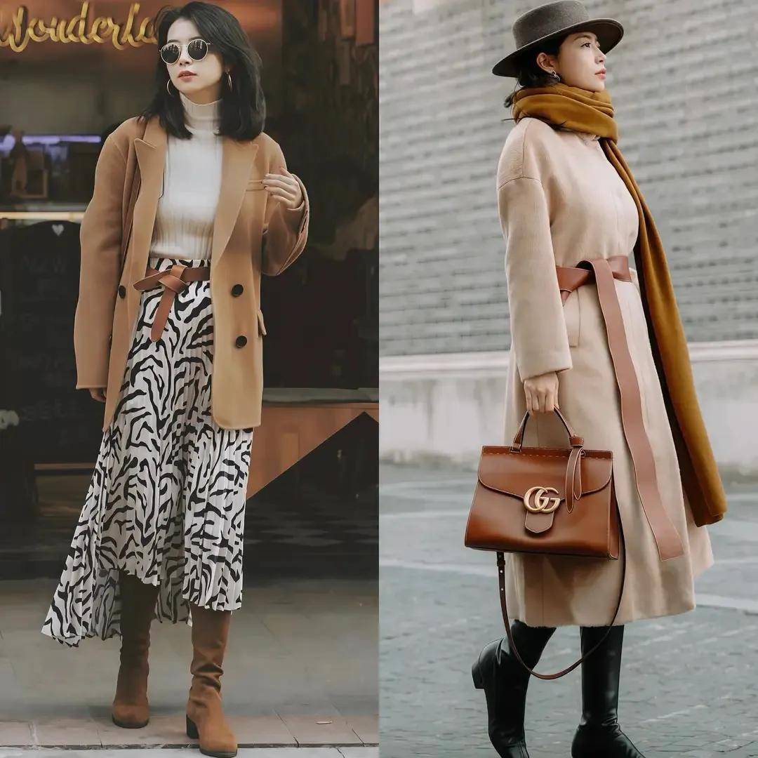 在这阴凉的冬天,咱们完全不错穿一件长款的地面色大衣,外衣长度盖过膝盖,衣角卡在小腿肚的位置就像上头这位前卫博主,下半身用一条半身裙来组合,再穿上玄色的骑士靴,就变成了“裙中靴”的搭配样貌,这么的穿搭造型既御寒又洋气。