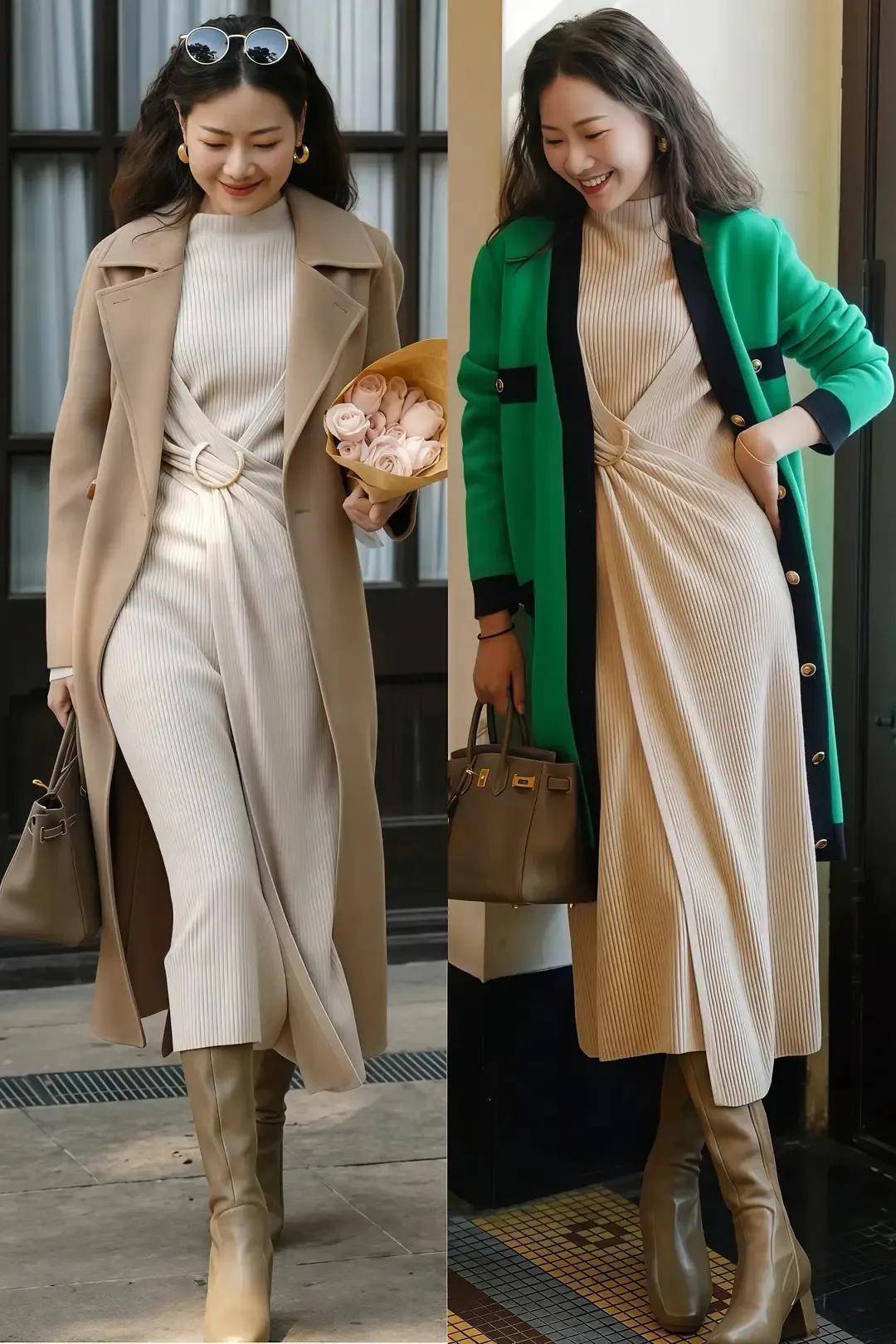 Tips③:大衣搭配连衣裙,脚穿高跟骑士靴,步碾儿自带风