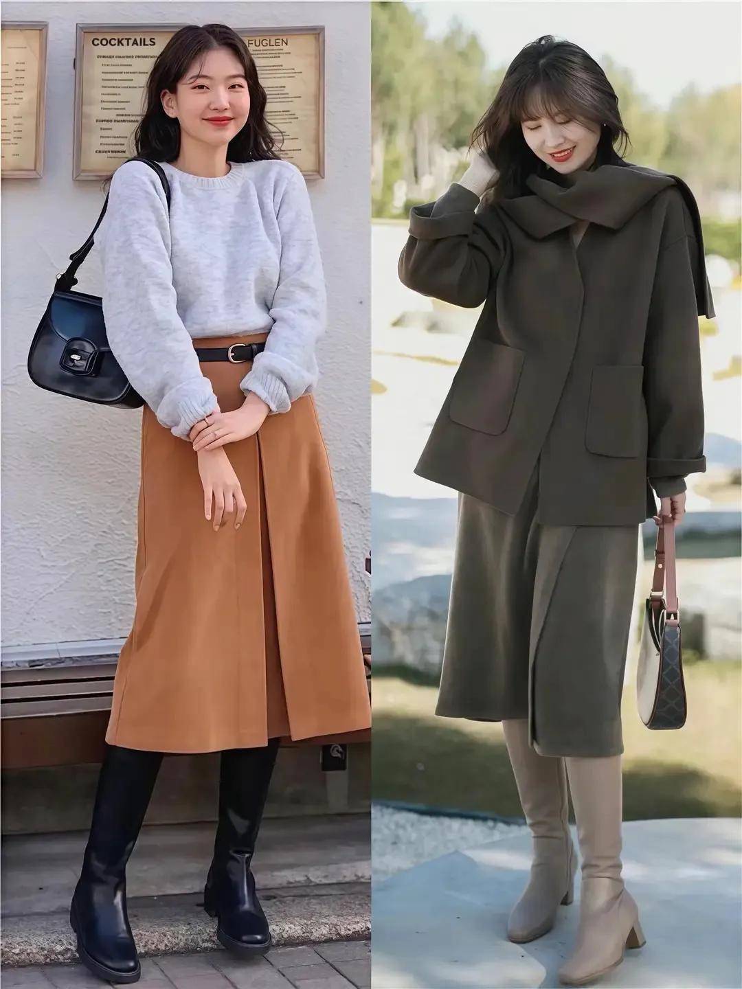 就好比上头这两套穿搭。就能呈现出昂贵的气质。用了亦然骑士鞋,搭配一条半身裙,加上大衣外衣,气场全开。
