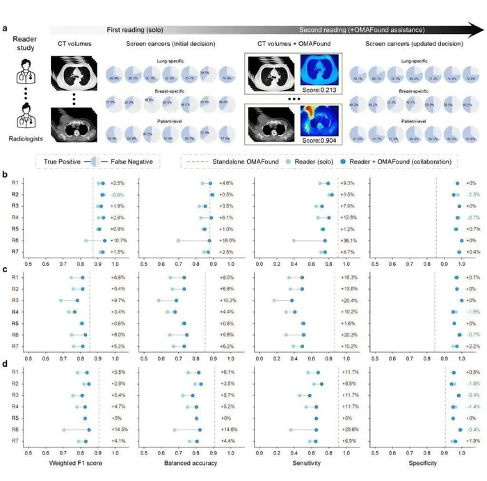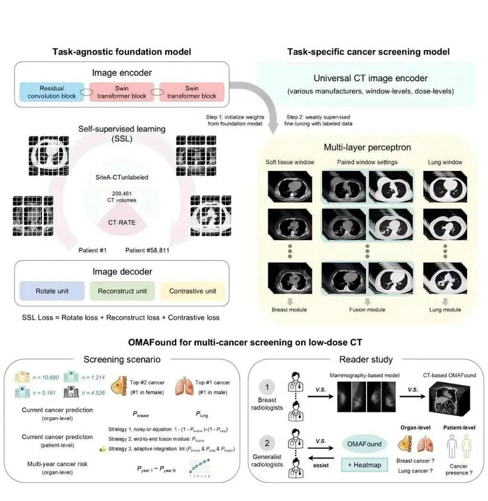 该究诘构建基于平日CT的“一扫多筛”癌症筛查模子OMAFound,终了对大众男性发病率第一的肺癌与女性发病率第一的乳腺癌的同步精确筛查,为破解传统“单癌单检”模式带来的时辰资本、经济职守及医疗资源占用等不毛提供了全新旅途,未来可膨胀至其他常见癌症的多癌种筛查,具有首要的临床价值与学术有趣有趣。