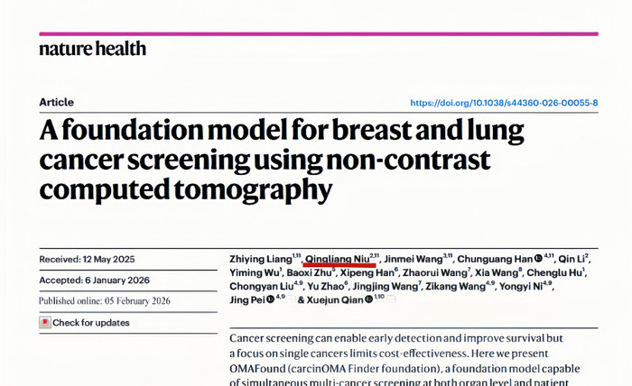 近日,潍坊市第二东谈主民病院(潍坊市呼吸病病院)牛庆亮阐明当作共同第一作家,与上海科技大学生物医学工程学院钱学骏阐明、安徽医科大学第一附庸病院裴静阐明等团队勾搭,在国外顶级学术期刊Nature全新子刊NatureHealth在线发表首要究诘放荡,题为“Afoundationmodelforbreastandlungcancerscreeningusingnon-contrastcomputedtomography(一种驾驭非对比性计较机断层成像期间进行乳腺癌和肺癌筛查的基础模子)”。