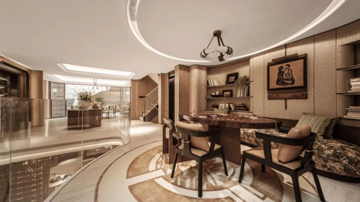 客厅与南向庭院径直连通,室内与户外的畛域在这里消融,从花圃拾级而下,前院与负一层彼此连通,酿成独到的双首层入户、双院落体验。