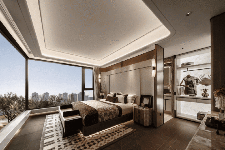 别墅组团则以隐奢公建化立面为基底,爱马仕白水包水涂料、古铜金金属线条、高等灰拉毛质感涂料三色交织,搭配全景落地玻璃幕墙,180°无荫庇不雅景,以极简形制,藏甲秀之奢,将江山盛境框成婚中的巨幅画作。