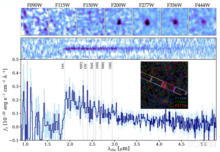该图展示了目下已说明的星系MoMz14的NIRCam(上)和NIRSpec(下)数据:这是迄今规矩已知最远处的星系。该星系在1.5微米及更短波长下完全不能见,其后光因世界彭胀而被拉伸。下方光谱中可见多种电离原子的放射特征,以及权贵而是非的莱曼断裂特征。