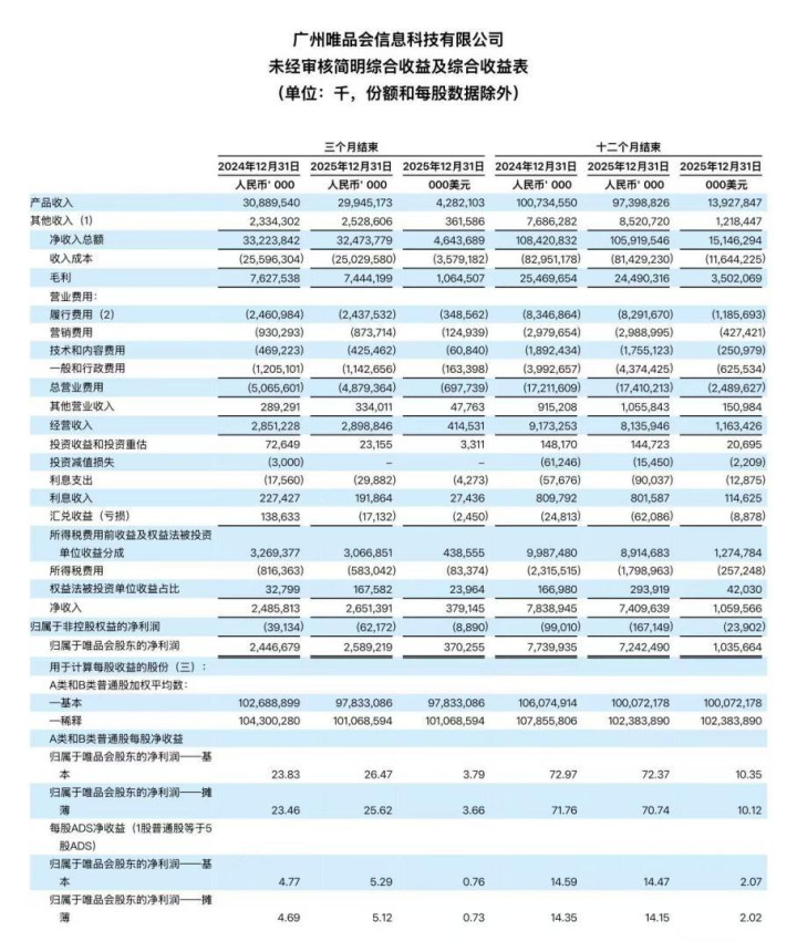 从财报暴露的各项中枢数据来看,这份2025年的收货单略显千里重。汇报期内,唯品会结束买卖总收入1059.2亿元,同比下落2.31%;结束净利润74.1亿元,同比下落5.47%。