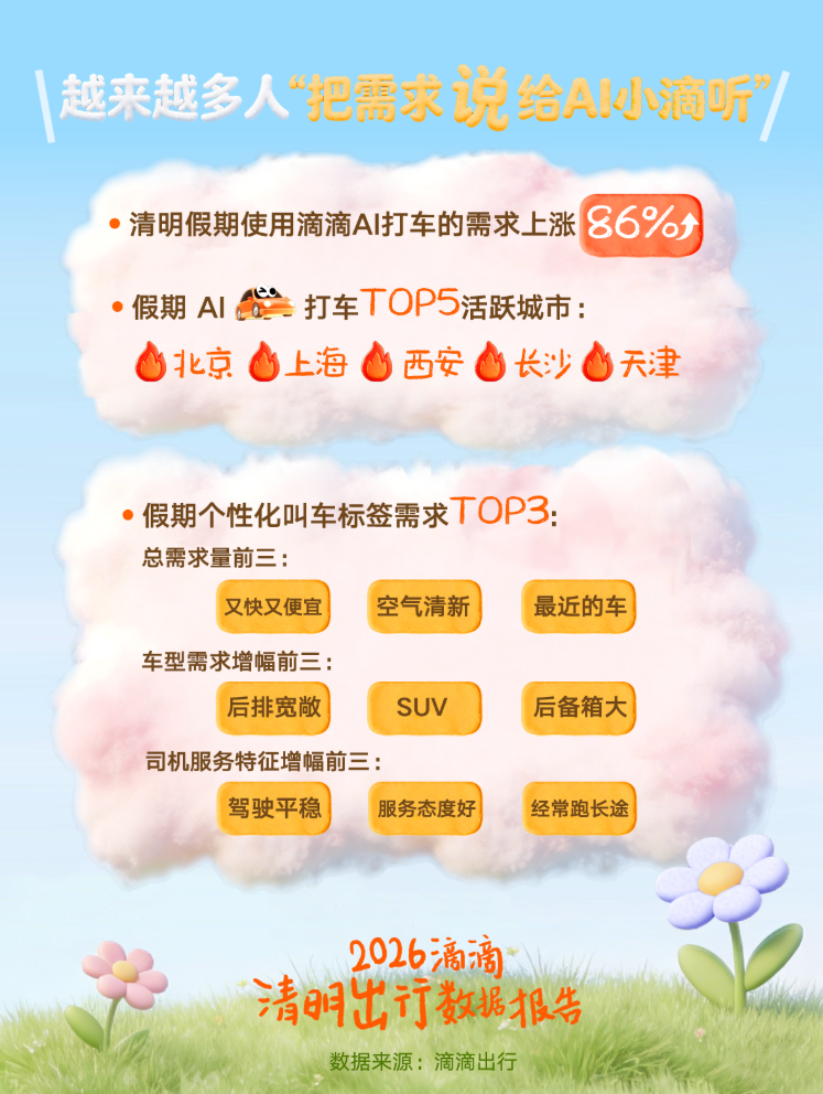 在假期出行数据方面,来自滴滴出行的数据败露,在出游踏青、返乡祭扫等需求叠加下,乐鱼体育官方网站通盘这个词晴明假期世界打车需求同比飞腾近15%。假期外乡旅游奢华需求苍劲,外乡打车需求比拟节前飞腾41%。滴滴租车订单量同比增长53%,滴滴充电需求同比飞腾45%。节前一周,使用滴滴AI打车的用户,比拟岁首加多了37倍。假期使用滴滴AI打车的需求合手续加多,订单比拟平日飞腾86%。其中,年青东谈主是使用AI的主力用户,00后占比超40%。