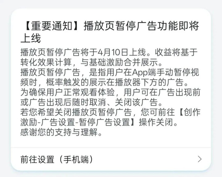 播放页暂停告白,是指用户在App端手动暂停视频时,概率触发的展示在播放器下方的告白。官方示意,为确保用户不雅看体验,用户不错通过点击“X”按钮随时关闭告白。