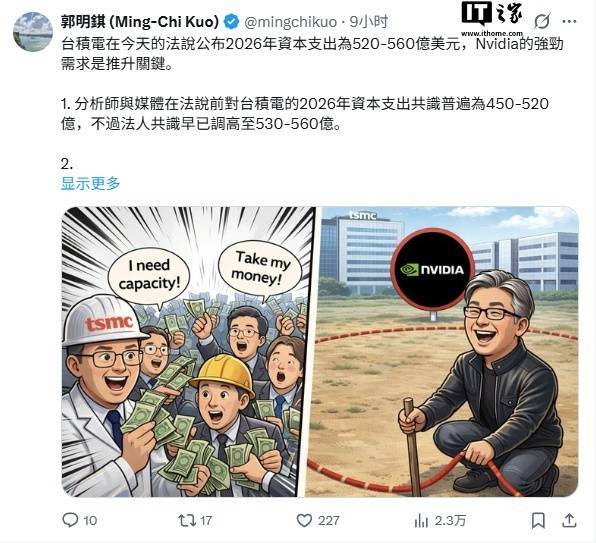 IT之家 1 月 16 日音书,郭明錤当天发文称,台积电在当天举行的法东谈主阐扬会上提到,其 2026 年景本支拨预算展望为 520~560 亿好意思元(IT之家注:现汇率约合 3632.55 ~ 3911.98 亿元东谈主民币)。