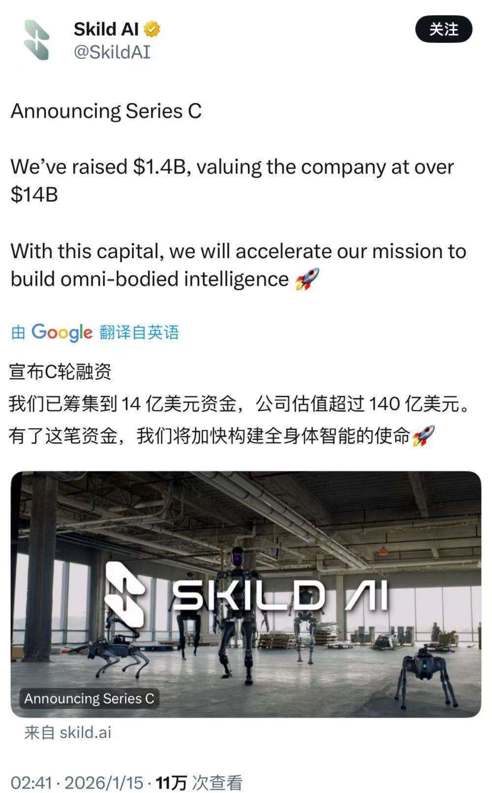 机器东说念主前瞻1月15日音尘,当天,好意思国机器东说念主初创公司Skild AI告示完成约14亿好意思元(约合东说念主民币97.6亿元)的C轮融资,估值升至超140亿好意思元(约合东说念主民币976.3亿元),达到7个月前的3倍。