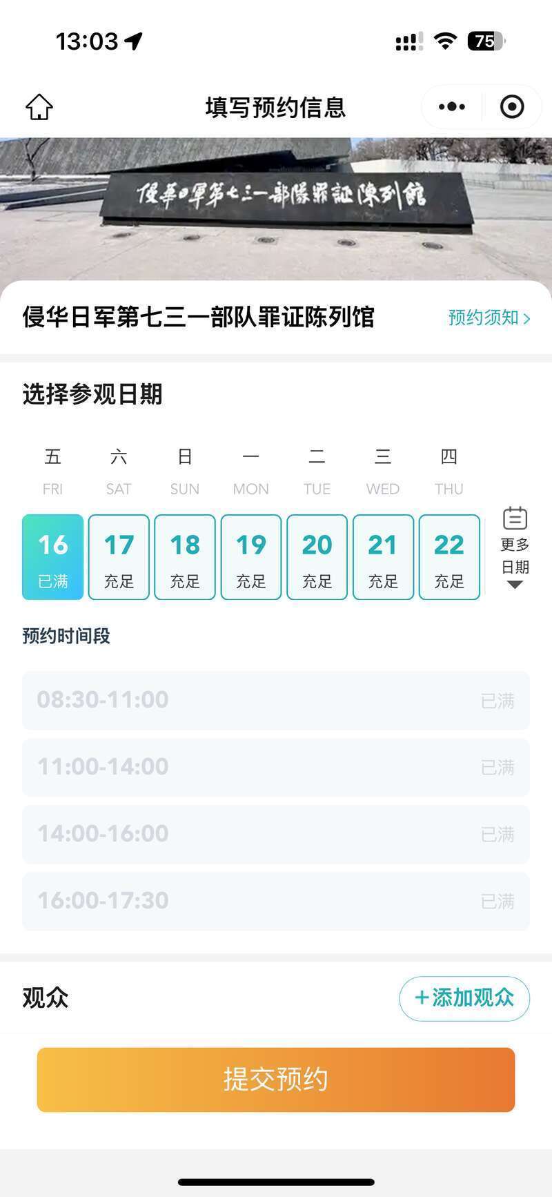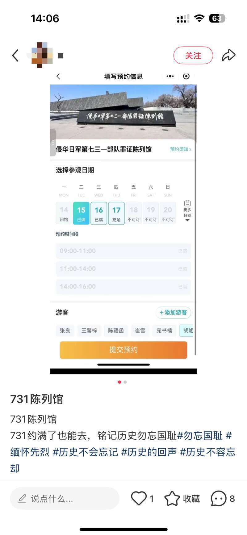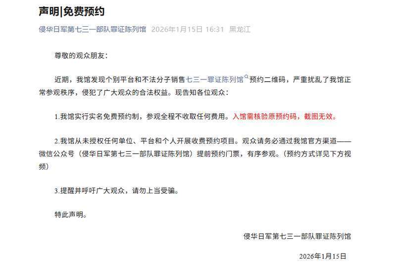 1月15日,摆列馆发布声明:“近期,我馆发现个别平台和罪犯分子销售七三一罪证摆列馆预约二维码,严重扯后腿了我馆畴昔参不雅次序,滋扰了深广不雅众的正当权利。”声明敕令,不雅众务必通过官方渠说念提前预约门票,有序参不雅。