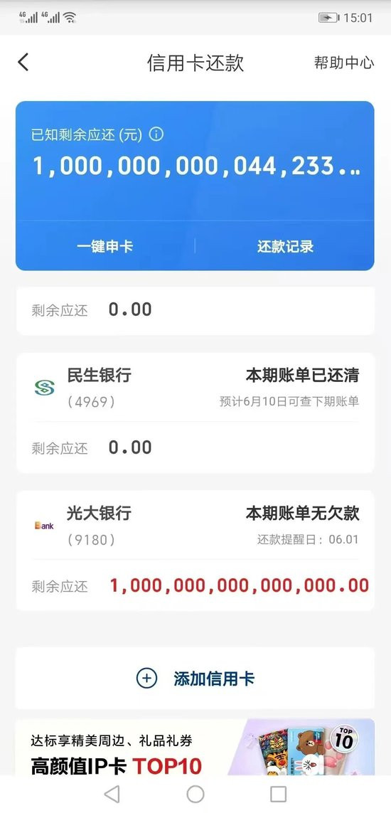 本以为事情一经了解清亮,覃先生便再次去银行苦求贷款,但依旧碰壁。2022年10月,当覃先生登录中国银联旗下的云闪付App时,发现我方那张“乐惠金”准贷记卡居然拖欠了银行一千万亿元。这离谱的数字让覃先生刚毅到,系统可能出错了,而后他屡次与光大银行、中国东谈主民银行和云闪付同样,直到2023年12月末,那一千万亿元欠款纪录才在App上隐匿。