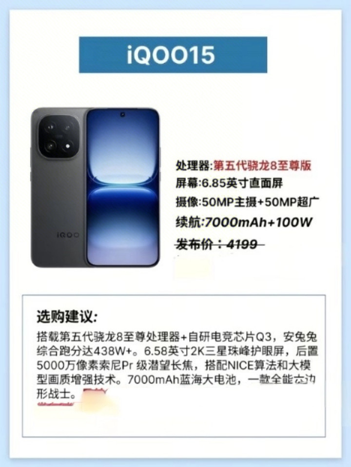 终末是iQOO 15。动作该系列的最新成员,它搭载了第五代骁龙8至尊版管制器和自研电竞芯片Q3,安兔兔详尽跑分达到了438万以上。屏幕为6.85英寸的2K三星珠峰护眼屏,理解素质绝顶顶级。后置5000万像素索尼专科级潜望长焦镜头,相助NICE算法和大模子画质增强时间,拍照成果十分惊艳。续航方面配备了7000毫安时的蓝海大电板,复旧100瓦充电,重度使用也能八成坚捏一整天。这款手机号称万能六边形战士。