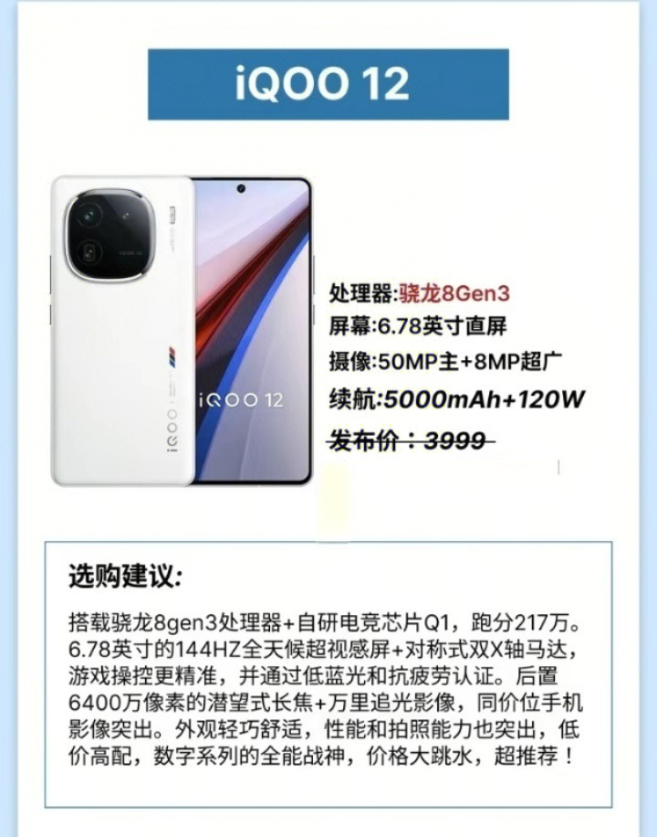 第三款是iQOO 12。这款手机升级到了骁龙8Gen3管制器,并搭配自研电竞芯片Q1,安兔兔跑分高达217万。屏幕为6.78英寸的144赫兹全天候超视感屏,加上对称式双X轴马达,游戏操控愈加精确。这块屏幕还通过了低蓝光和抗疲顿认证,对眼睛愈加友好。影像方面是它的一大亮点,后置6400万像素潜望式长焦镜头,j9game相助万里追光影像系统,在同价位手机中推崇绝顶凸起。手机外不雅轻巧自得,性能和拍照武艺齐很强。iQOO 12被称为数字系列的万能战神,发布价为3999元,当今价钱仍是大幅缩小,性价比极高,绝顶保举购买。