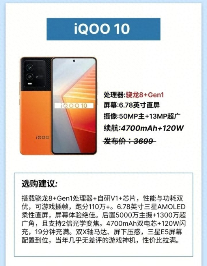 最初是iQOO 10。这款手机搭载了骁龙8+Gen1管制器和自研V1+芯片,性能与功耗收敛绝顶平衡。它复旧游戏插帧功能,安兔兔跑分可以达到110万以上。屏幕方面收受6.78英寸的三星AMOLED柔性直屏,理解成果绝顶出色。后置录像头为5000万像素主摄加1300万像素超广角,况兼复旧2倍光学变焦,平常拍照十填塞用。续航上配备了4700毫安时双电芯电板和120瓦闪充,仅需19分钟就能充满。此外它还领有双X轴线性马达和屏下压感功能,相助三星E5屏幕,全体设立绝顶到位。这款手机在往常险些莫得任何差评,是公认的游戏神机,性价比绝顶高。它的发布价是3699元,如今在二手阛阓愈加实惠。