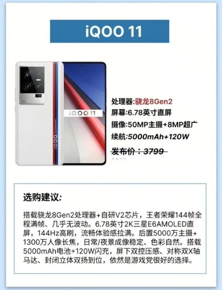 接下来是iQOO 11。它搭载了骁龙8Gen2管制器和自研V2芯片,在初始王者荣耀等游戏时可以完结144帧全程满帧,画面险些莫得波动。屏幕收受6.78英寸的2K分辨率三星E6 AMOLED直屏,复旧144赫兹高刷新率,率领感绝顶出色。后置录像头为5000万像素主摄加1300万像素东说念主像长焦,平常和夜景拍摄齐能得到雄厚的成像和当然的颜色。电板容量提高到了5000毫安时,相助120瓦闪充,续航推崇愈加捏久。屏下双控压感、对称式双X轴马达以及阻滞式立体双扬声器也一应俱全。关于游戏玩家来说,iQOO 11依然是绝顶好的选拔。它的发布价为3799元,性能推崇放在2026年也绝不落后。