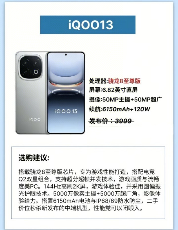 第四款是iQOO 13。它搭载了骁龙8至尊版芯片,专为游戏性能打造。相助电竞Q2双星组合,复旧超分超帧并发时间,游戏画质和率领度绝顶接近PC级别。屏幕收受144赫兹高刷2K屏,游戏体验极佳,同期还使用了圆偏振光护眼时间,可以有用减少眼部疲顿。后置录像头为5000万像素主摄加5000万像素超广角,影像推崇相同过劲。电板容量大幅提高至6150毫安时,并复旧120瓦快充。此外它还具备IP68和IP69级别的防尘防水武艺。在二手阛阓上,iQOO 13的价钱可以八成秒杀许多新发布的中端机型。性能党十足可以闭眼出手。它的发布价是3999元,但实质成交价仍是愈加亲民。